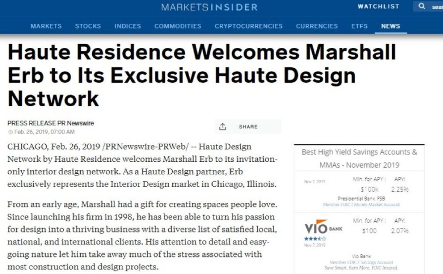 Haute Residence Welcomes Marshall Erb to Its Exclusive Haute Design Network